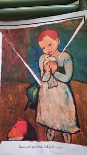 Para celebrar el día de la Paz y la no violencia realizamos diversas actividades de aula y otras conjuntas con el resto del cole. Algunas de las actividades de aula se han basado en determinadas obras de arte y canciones. En cuatro y cinco años hemos trabajado con la obra "Niña con paloma" de Pablo Ruiz Picasso, ya que hemos querido combinar el símbolo de la paloma de la Paz con la unidad de "Los juegos y los juguetes" que estábamos trabajando en ese momento. Nuestras acuarelas y puzles han quedado así de bonitos